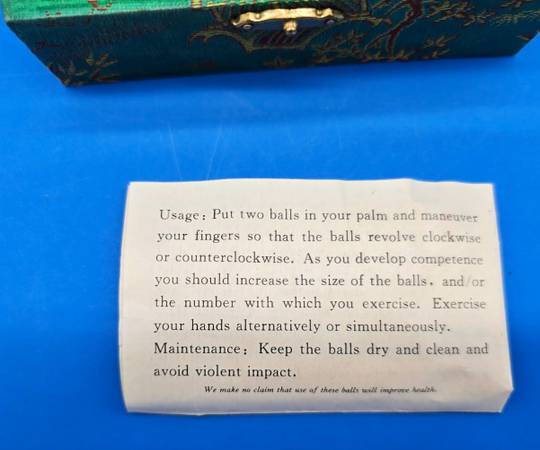 The Baoding Balls Chinese Hand Exercise Balls are traditional Chinese therapy balls designed for stress relief and hand therapy. Made in China, these 1.75-inch balls come in a fabric covered box of 2. The balls are made of stone and are quite beautiful, as well as the box which is in excellent condition. With a focus on Chinese culture, these balls are a collectible item that can be used for hands to promote wellness and relaxation. Also comes with the original informational paper. Please review the photos for more details.